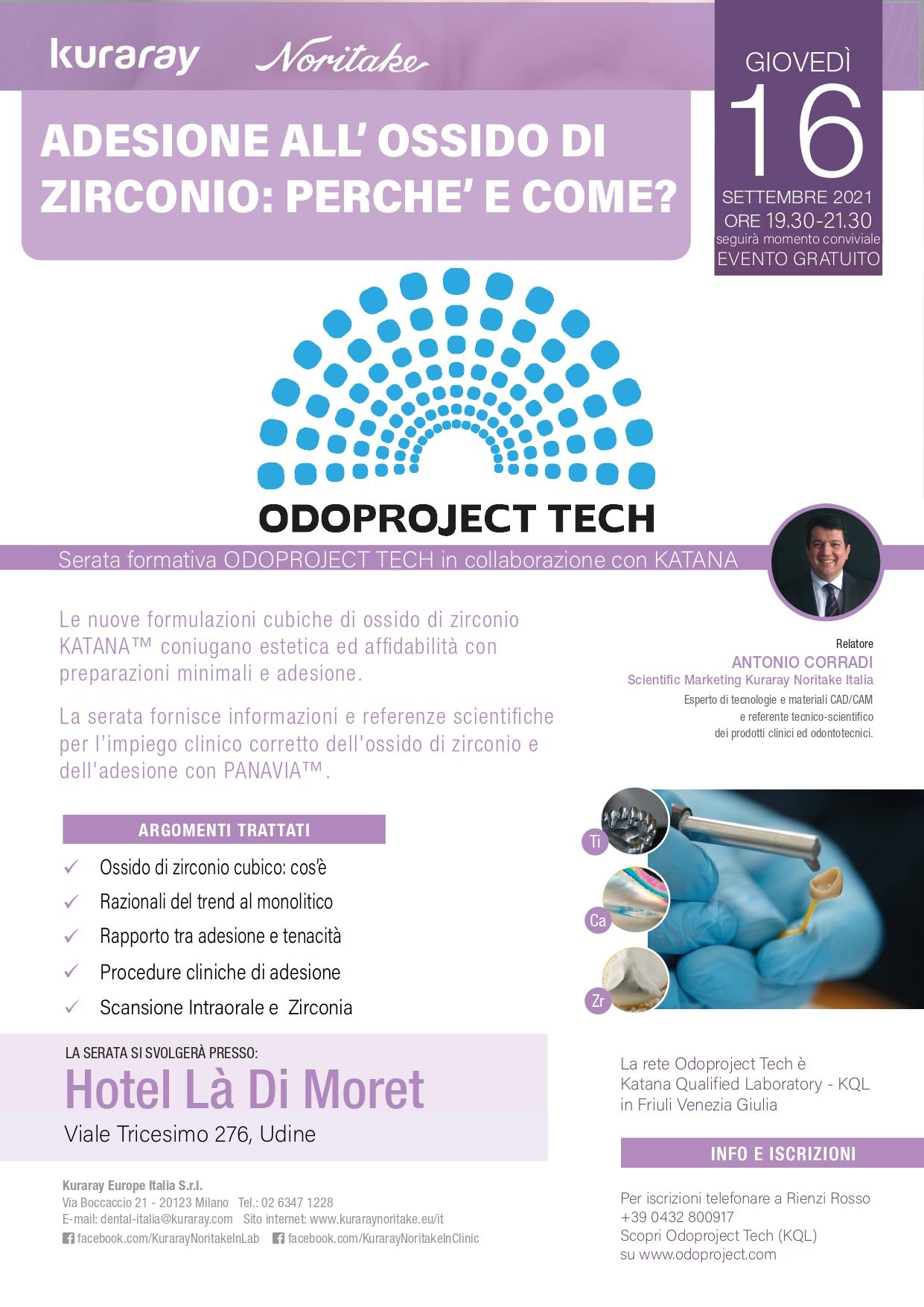 Giovedì 16 settembre 2021, dalle ore 19.30 alle 21.30 presso l'Hotel Là di Moret di Udine, si terrà una serata formativa ODOPROJECT TECH in collaborazione con KATANA dal titolo "Adesione all'Ossido di Zirconio: perché e come?". Seguirà momento conviviale.